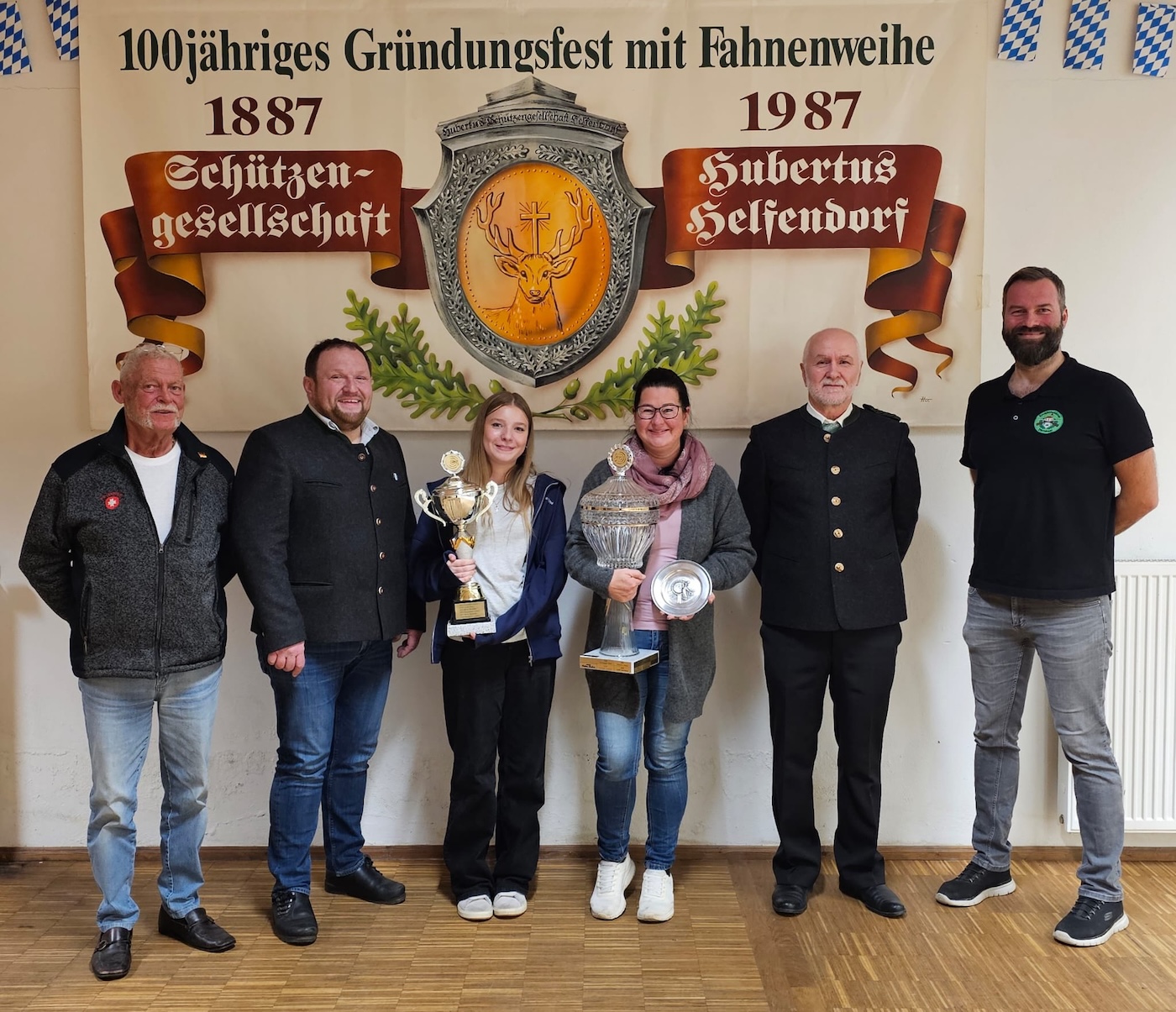 v.l.n.r. 1. Schützenmeister Hubertusschützen Helfendorf Peter Weinberg-Hoffmann, Bürgermeister & 1. Schützenmeister Spielhahnschützen Aying-Peiß Peter Wagner, Gemeindepokalsieger (Jugend) Magdalena Lanz, Gemeindepokalsieger (Erwachsene) Dagmar Werner, 2. Schützenmeister Hubertusschützen Helfendorf Bertold Königseder, 1. Schützenmeister Kirchfeldschützen Dürrnhaar Maximilian Wimmer