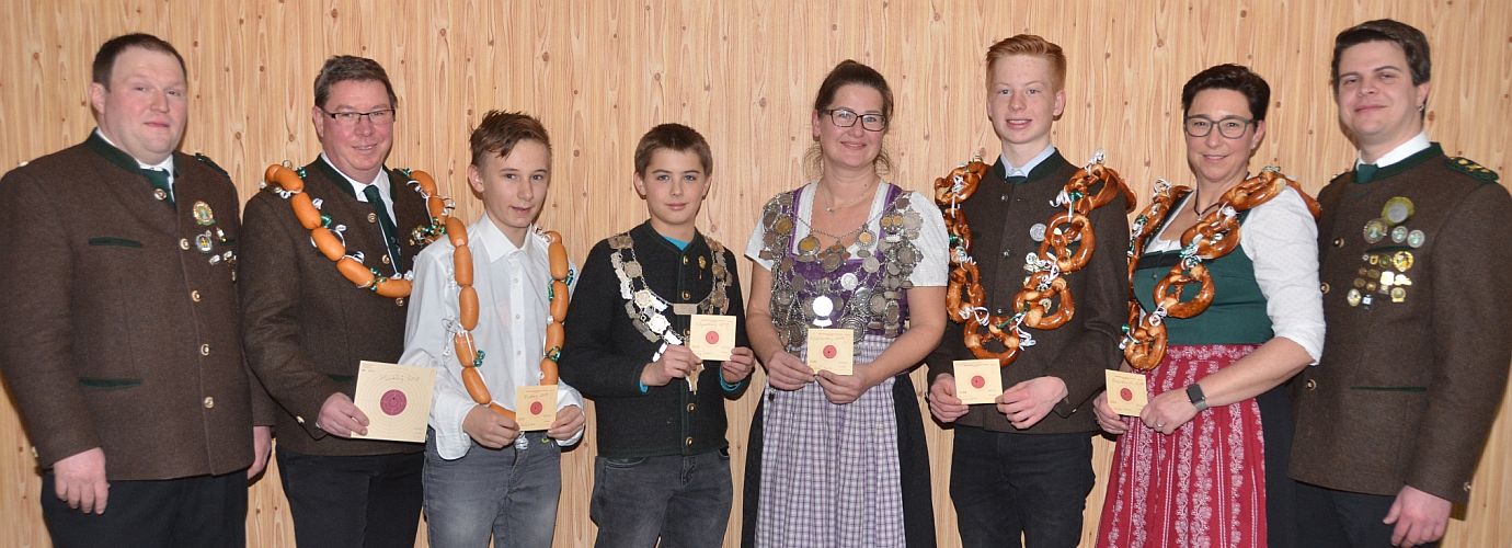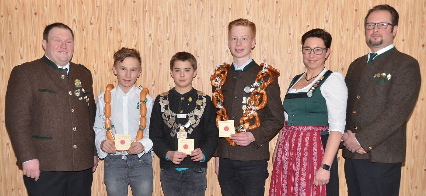 v.l.n.r.: 1. Schützenmeister Peter Wagner, Jugend-Vize-König Lukas Thoma, Jugend-König Raffael Krug, Jugend-Brezen-König Luca Werner, 2. Jugendsportleiterin Miriam Springer, 3. Jugendsportleiter Sebastian Werner